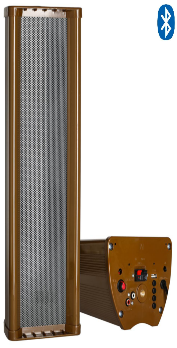 全天候设计,防水外壳,选用防水单元,室内外均 宜,寿命长,声音清晰、明亮;配有安装支架,安装便捷; 自带功放/一路AV输入/一路AV输出/USB接口/蓝牙/ 话筒选配
