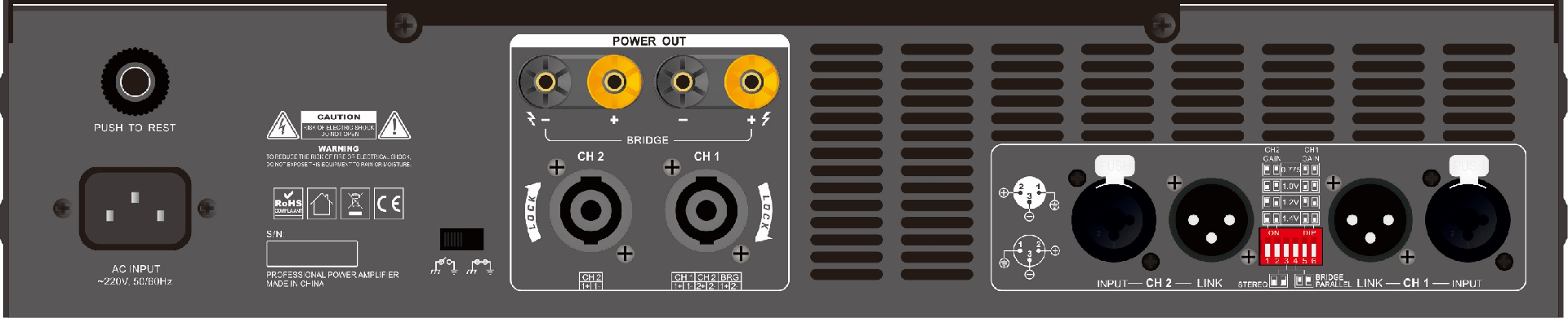 ▲具有回路断开按钮,当功放过载时回路断开按钮自动弹起切断电源,从而起到过载保护功能
