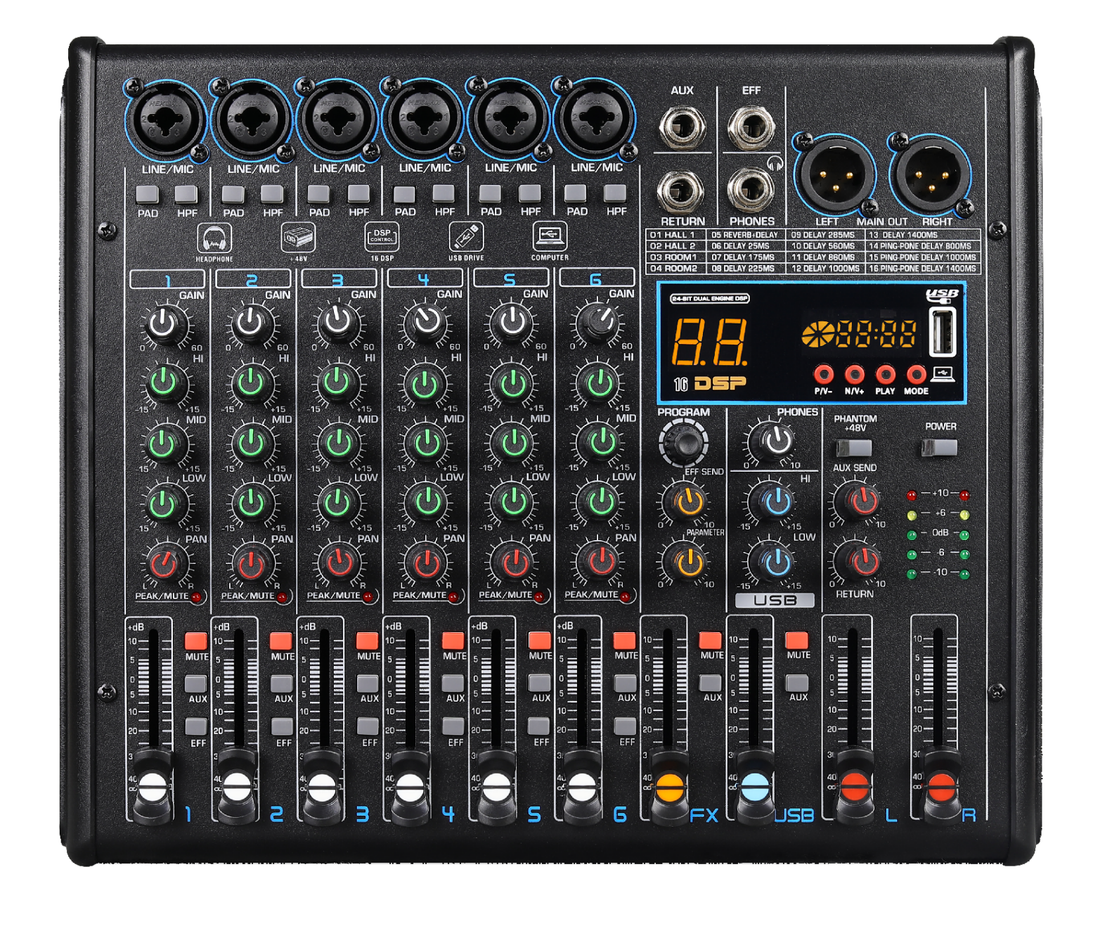 4.每路单声道输入通道设有3段EQ,设有峰值指示灯。