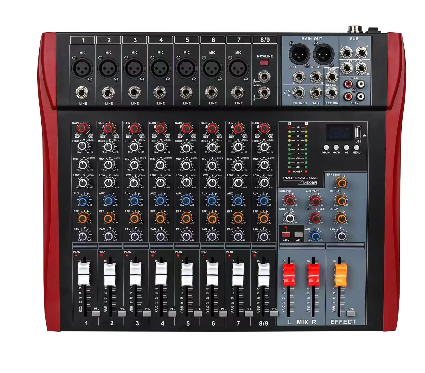专业9路调音台,具备7路单声话筒输入,一组立体声输入