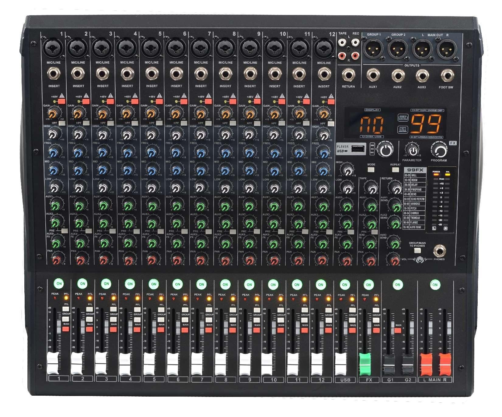 产品描述:功能特点:1.专业型蓝牙式调音台,采用超低噪声离散式麦克风前置放大器和+48V幻象电源,功能强大齐全,音质动听。2.提供12路Mic输入接口兼容12路线路输入接口,12路断点(I···