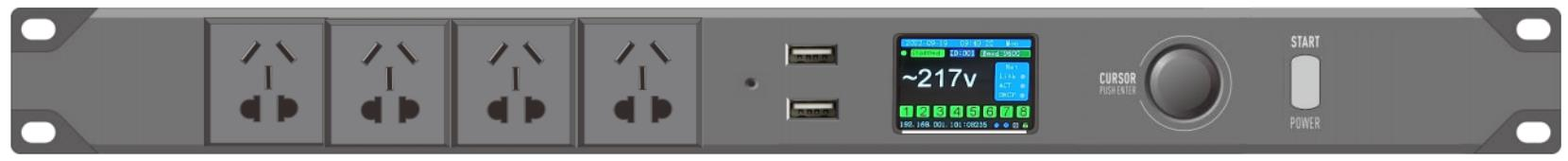 5、 前面板:一键飞梭手动旋钮、通道全开启关闭手动操作按钮、2寸全彩TFT液晶屏、配4路直通220V电源接口、2路USB DC-5V插座(1A直流供电接口),用于照明或手机/平板充电(需要提供证明文件)。
