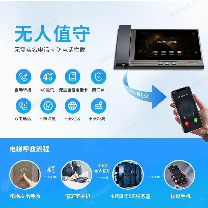中鼎泽华品牌4G物联网电梯五方通话对讲系统,是基于物联网技术推出的新一代电梯无线通话产品。 采用物联网通讯网关接入电梯现有模拟对讲系统,通过4G或有线网络的方式,实现与监控中心主机进行呼叫通话,无距离限制,无需布线; 网关同时兼容现有2线/4线模拟对讲器,即插即用,升级维护成本低,为客户提供一个高效快捷的电梯五方对讲解决方案。 该系统采用先进的数字编码技术,采用云端服务器+本地管理模式,具备平台通话录音功能,给用户带来一个方便稳定可靠的五方对讲通信系统。 产品特点● APP/PC远程管理● 有网络即可通话,使用4G物联网卡,无干扰,无距离限制● 无需布线,即插即用,终身免流量费用● 网关支持4G,有线网络联网方式,根据实际网络情况自由选择● 支持二线、四线模拟设备,适配市面上大部分电梯对讲系统,声音清晰,没有距离限制● 一台网关设备最多支持4台电梯对讲接入,节省成本● 单监控主机最多可以支持64台电梯,满足绝大部分客户使用需求● 监控室主机可以放置在任意位置,不需要专业值守人员,适配不同使用场景● 提供两款多功能监控中心主机,满足不同客户需求● 支持微信小程序设置紧急呼叫电话号码.● 支持对讲录音云备份功能,可进行通话录音回播功能
